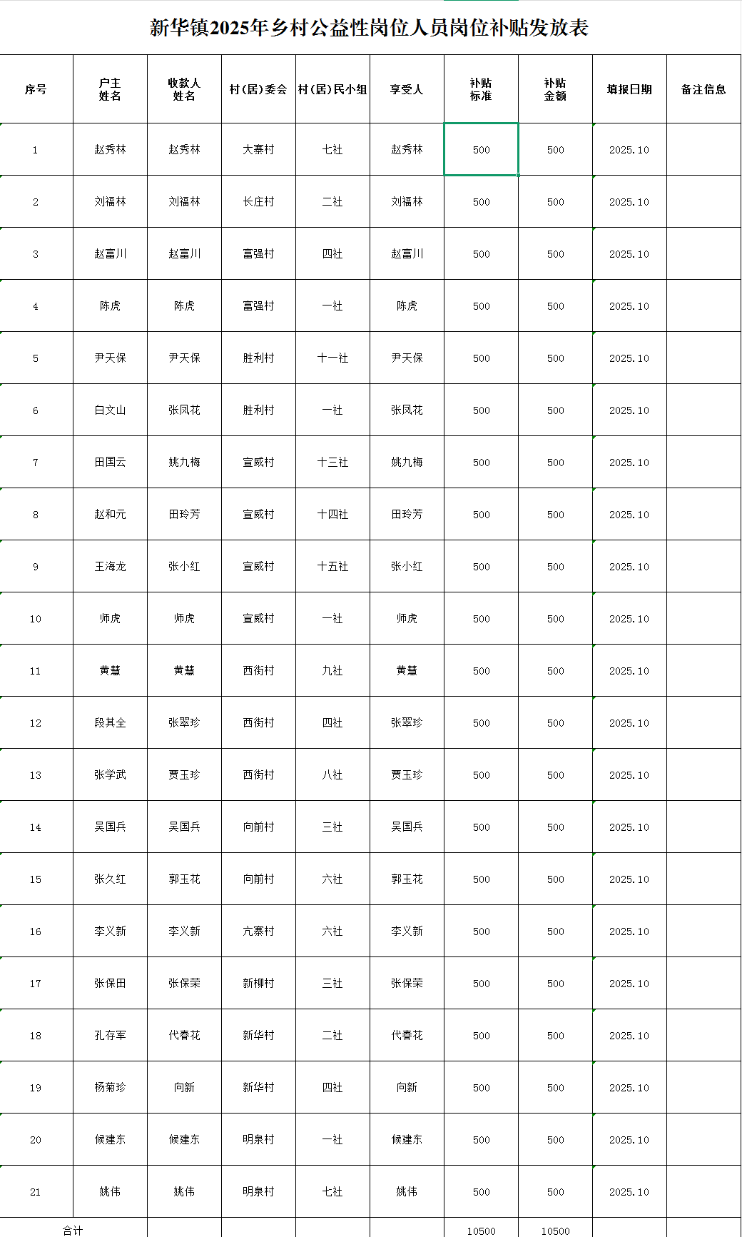 新华镇2025年10月乡村公益性岗位人员岗位补贴发放表