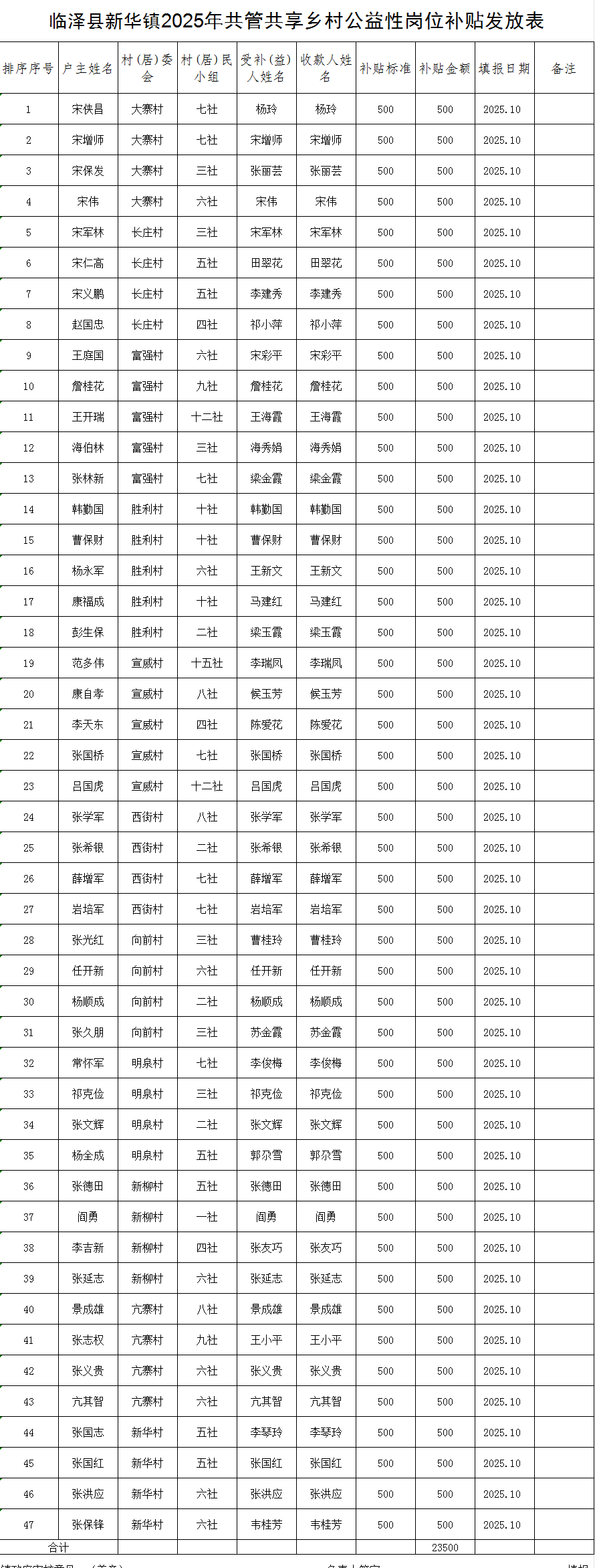 临泽县新华镇2025年共管共享乡村公益性岗位补贴发放表