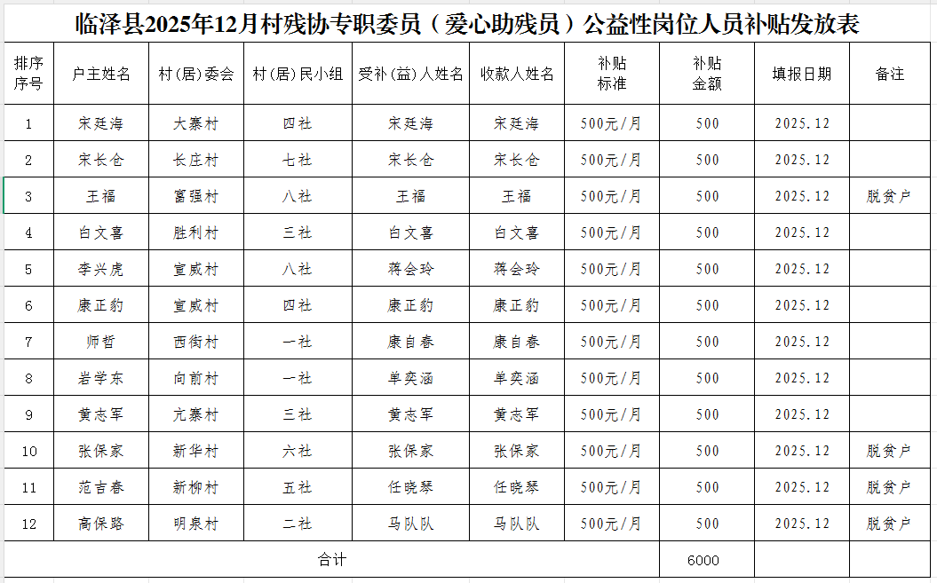 临泽县2025年12月村残协专职委员(爱心助残员)公益性岗位人员补贴发放表