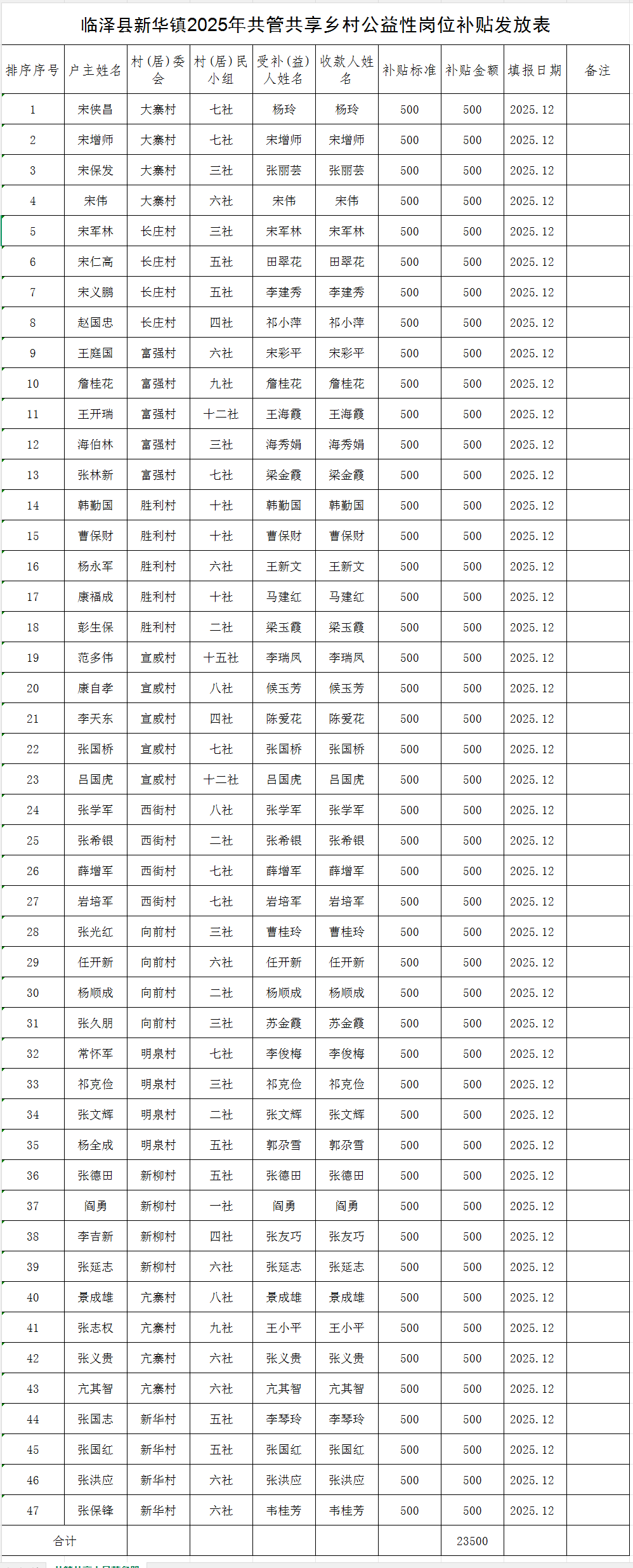 临泽县新华镇2025年共管共享乡村公益性岗位补贴发放表