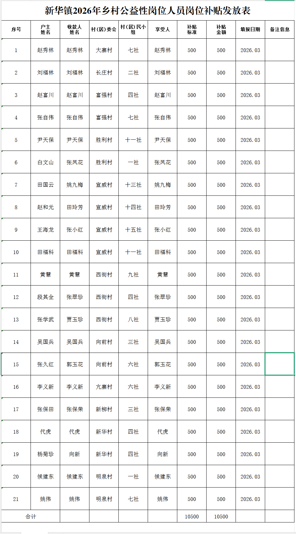 新华镇2026年乡村公益性岗位人员岗位补贴发放表