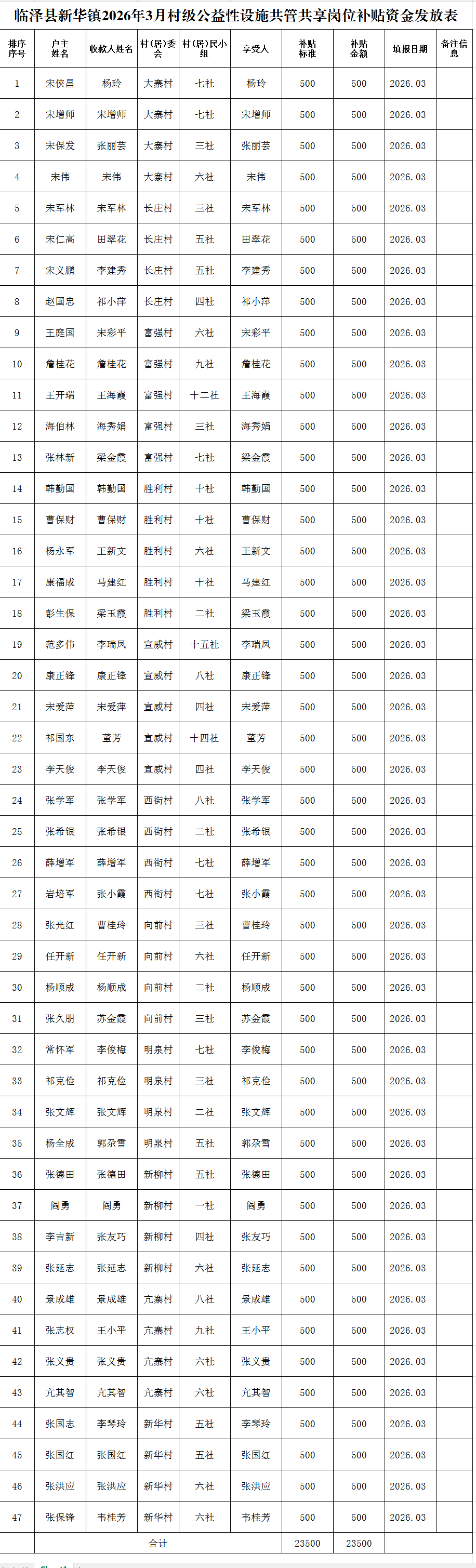 临泽县新华镇2026年3月村级公益性设施共管共享岗位补贴资金发放表
