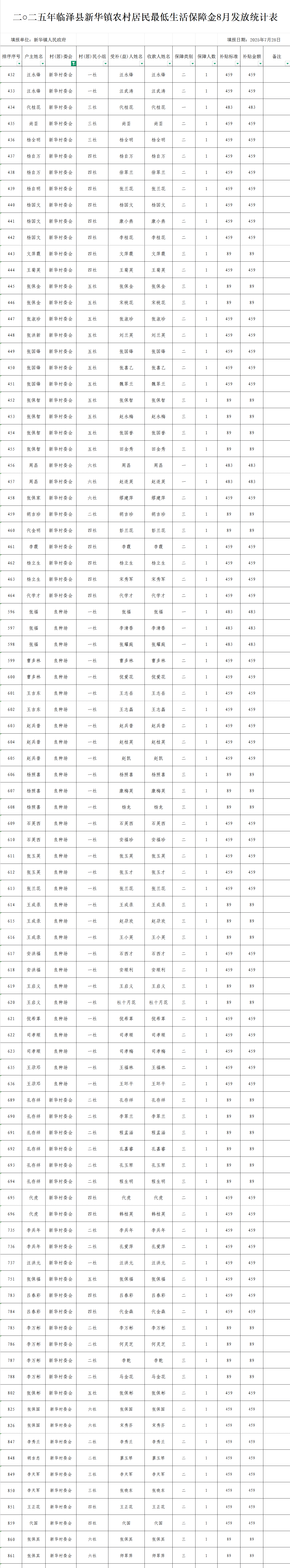 2025年临泽县新华镇新华村农村低保8月发放统计表