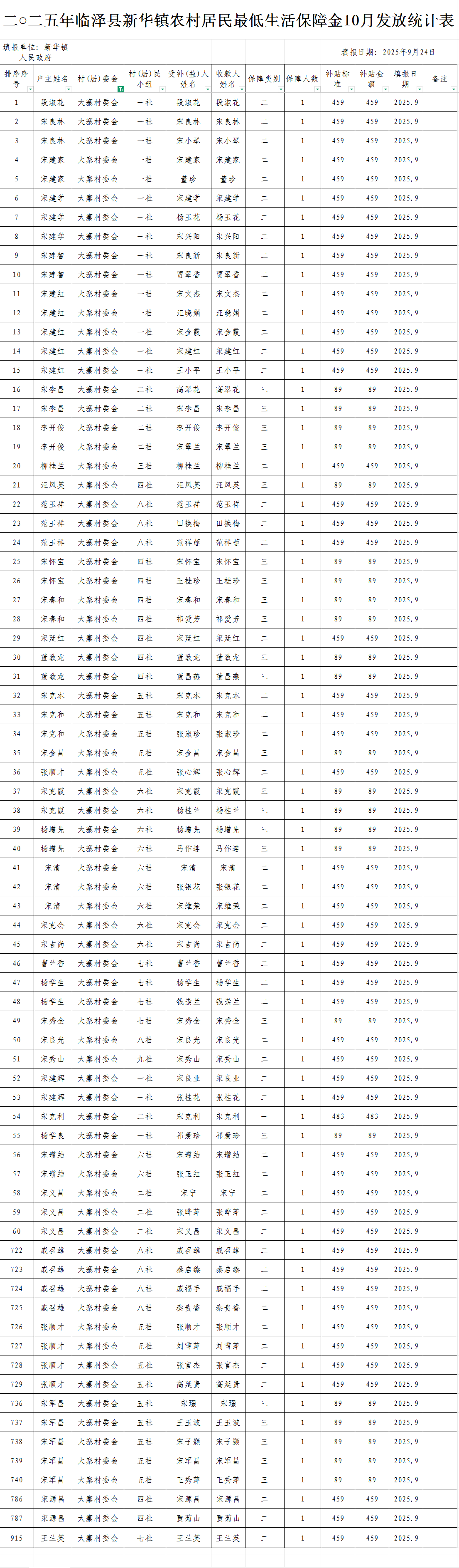 2025年临泽县新华镇大寨村农村低保10月发放统计表