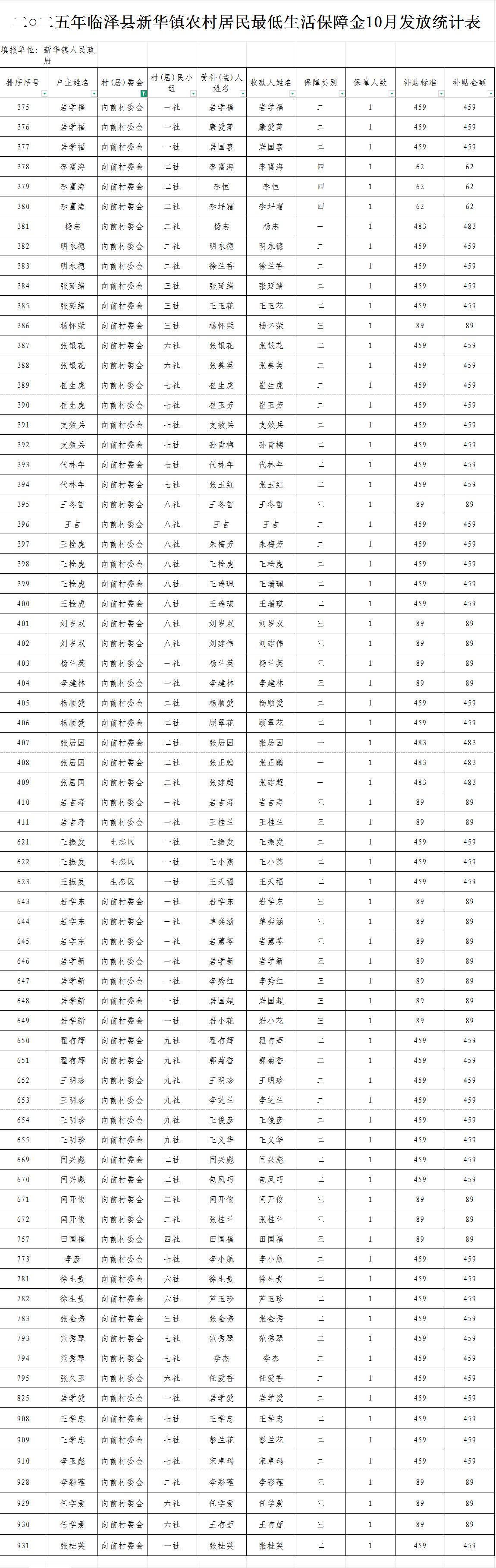 2025年临泽县新华镇向前村农村低保10月发放统计表