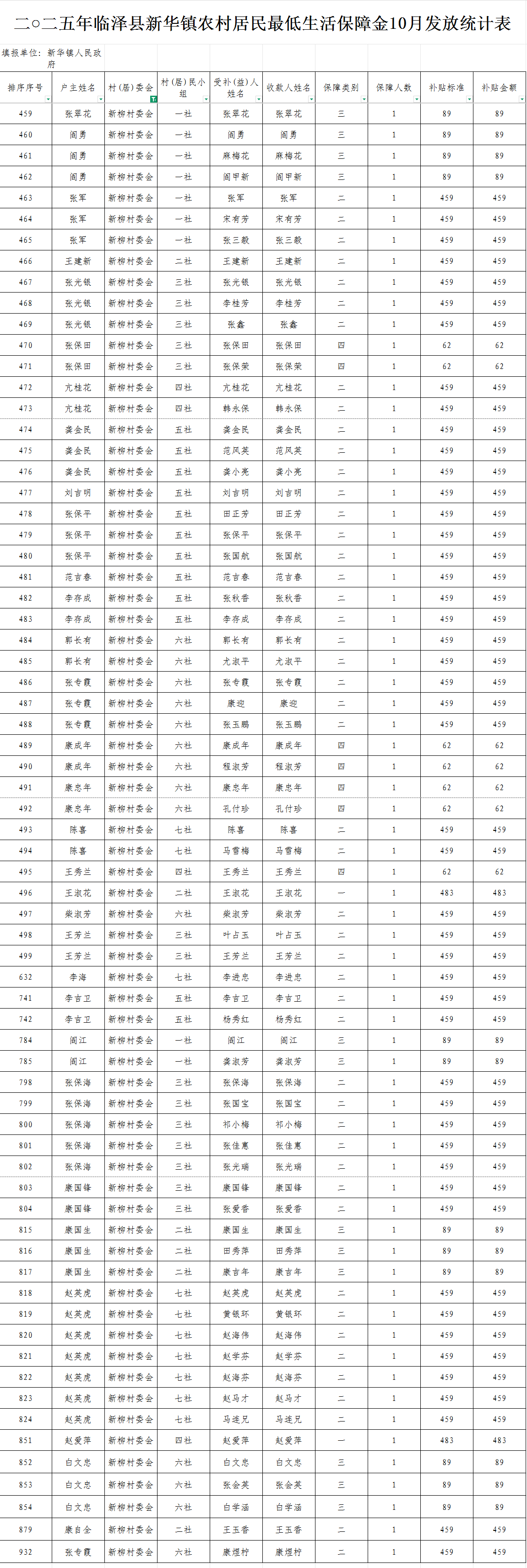 2025年临泽县新华镇新柳村农村低保10月发放统计表