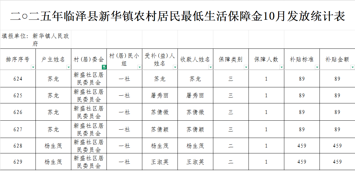 2025年临泽县新华镇新盛社区农村低保10月发放统计表