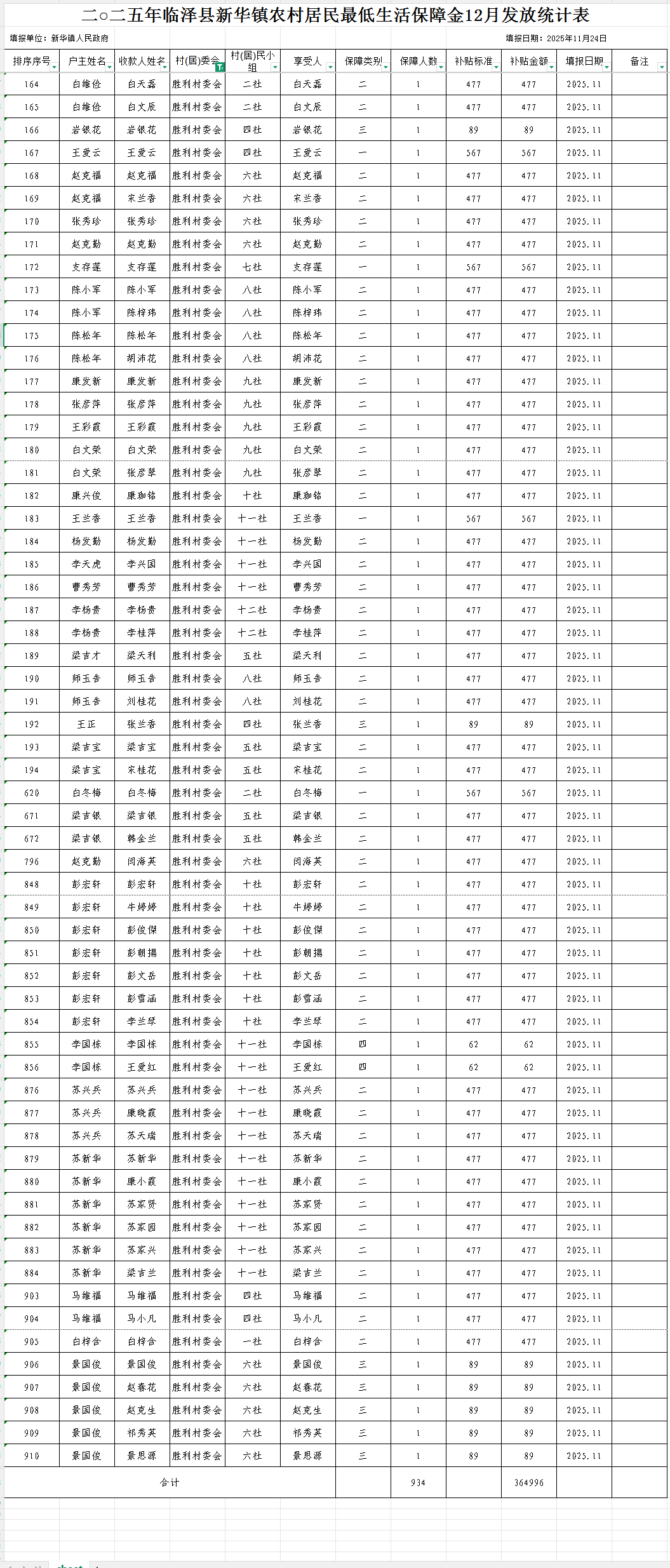2025年临泽县新华镇胜利村农村低保12月发放统计表