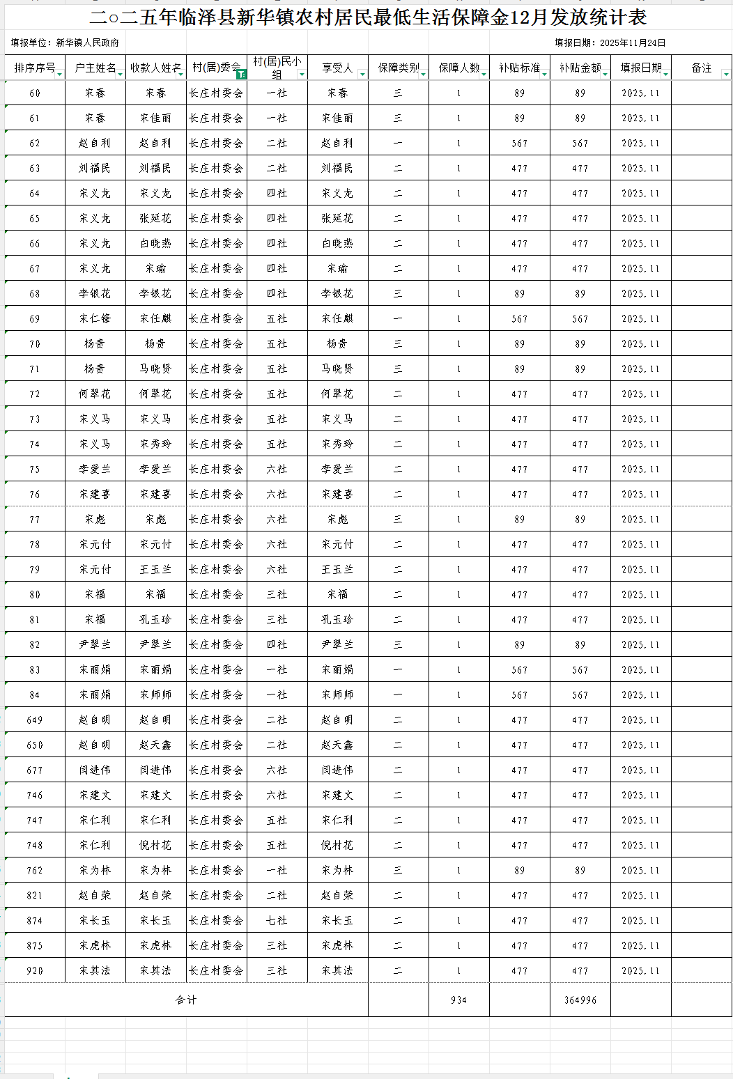2025年临泽县新华镇长庄村农村低保12月发放统计表