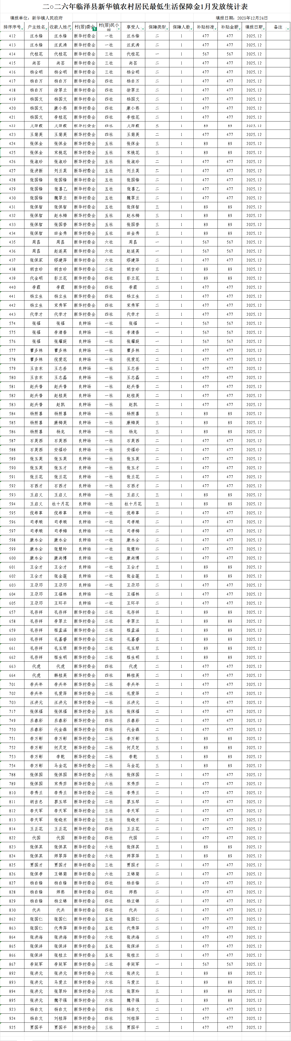 2026年临泽县新华镇新华村农村低保1月发放统计表
