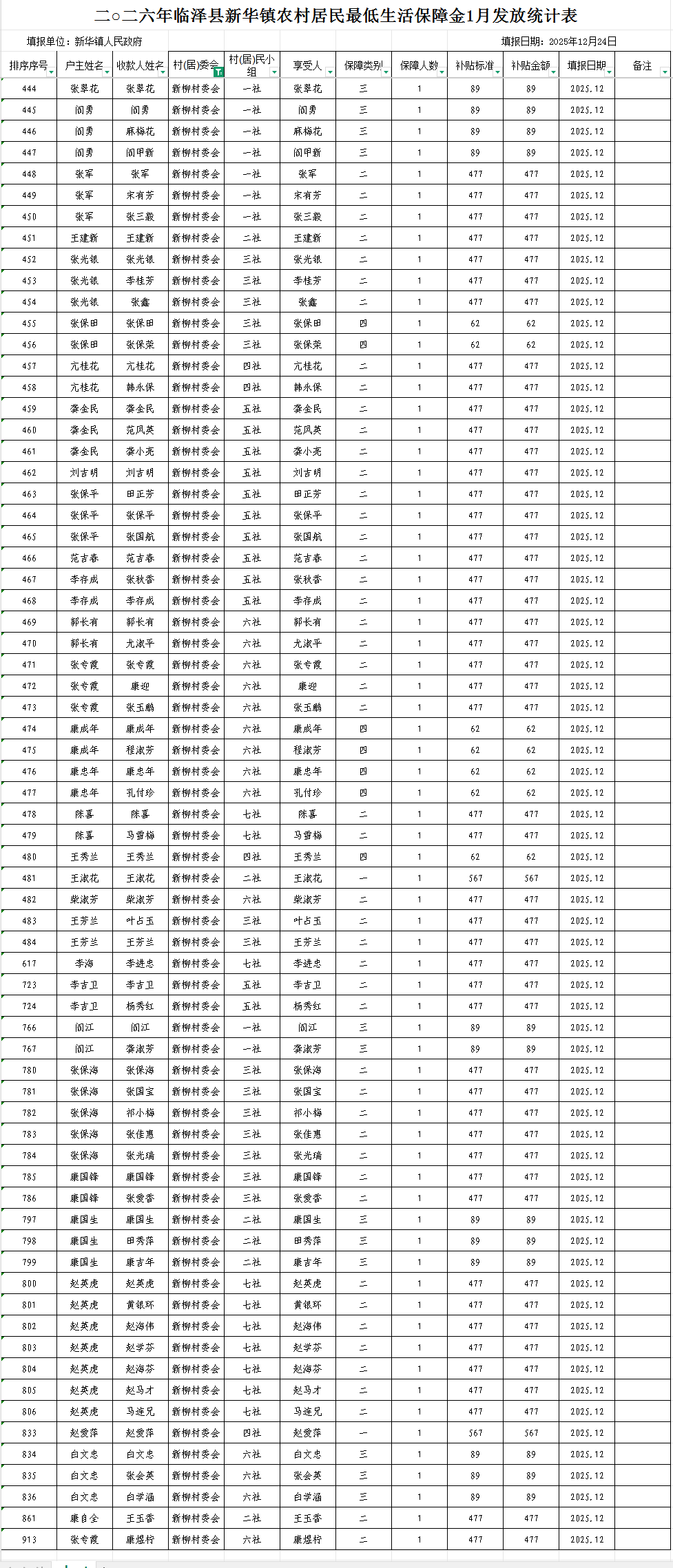 2026年临泽县新华镇新柳村农村低保1月发放统计表