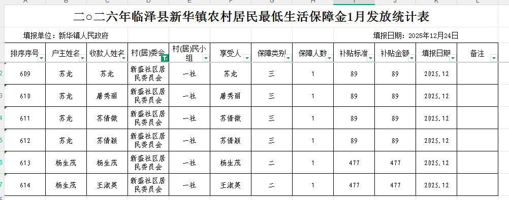 2026年临泽县新华镇新盛社区农村低保1月发放统计表