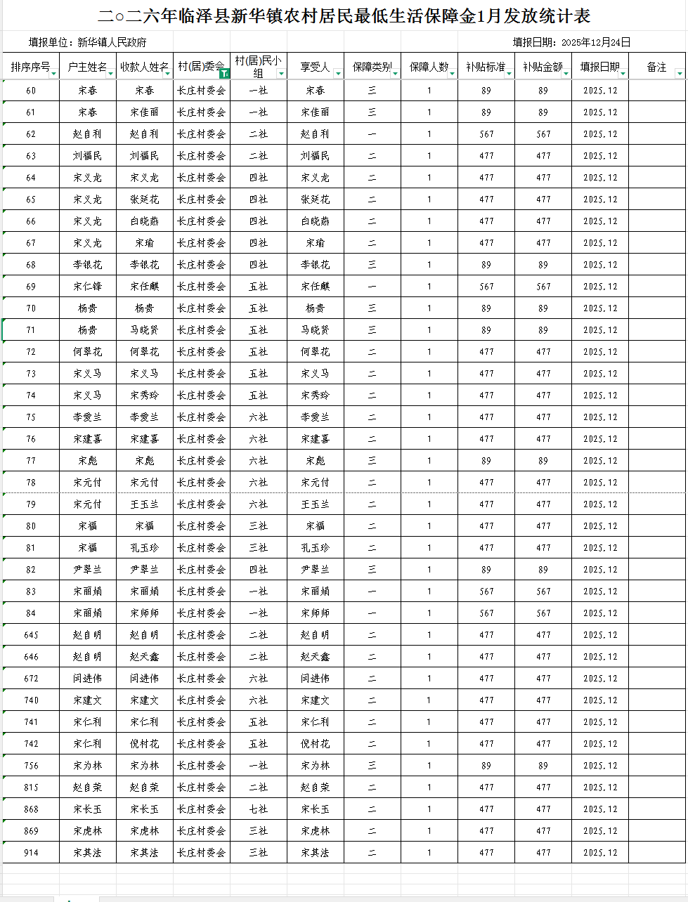 2026年临泽县新华镇长庄村农村低保1月发放统计表