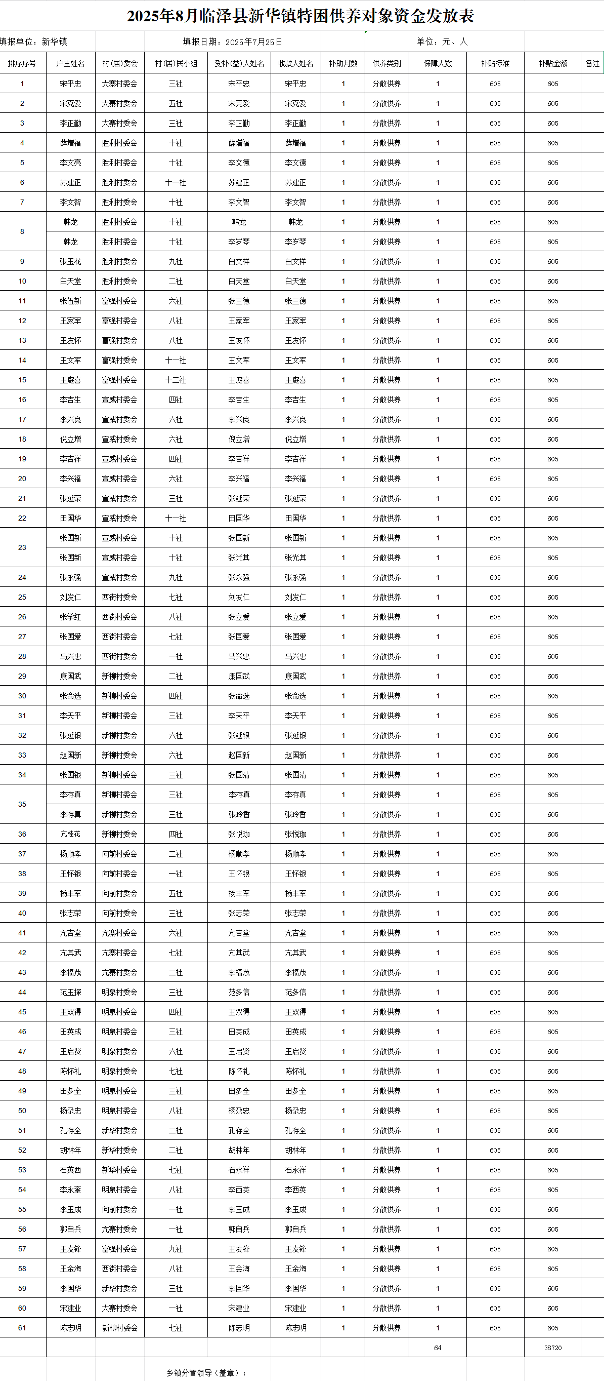 2025年8月临泽县新华镇特困供养对象资金发放表