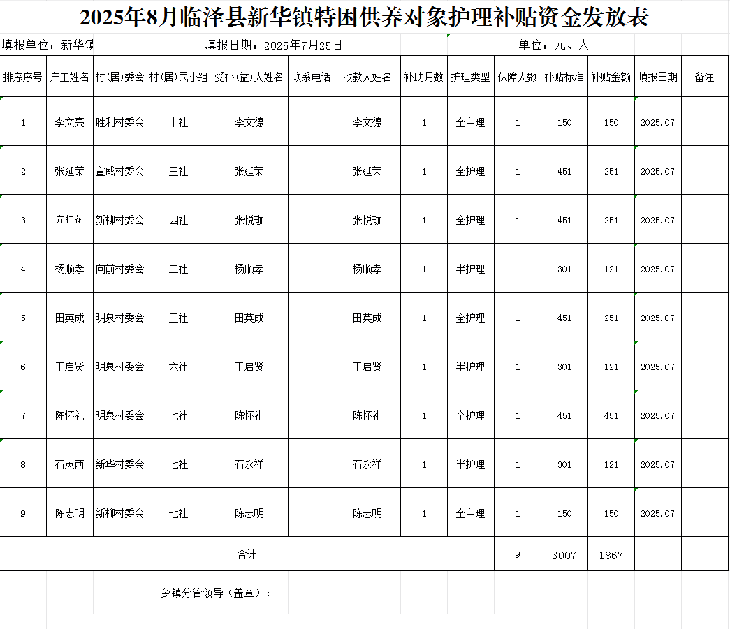 2025年8月临泽县新华镇特困供养对象护理补贴资金发放表