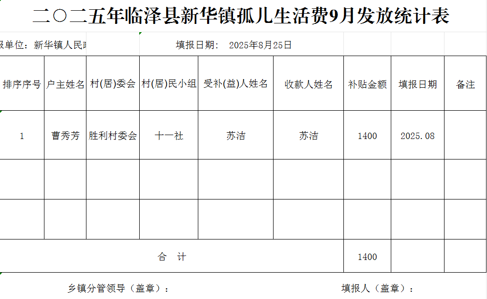2025年临泽县新华镇孤儿生活费9月发放统计表