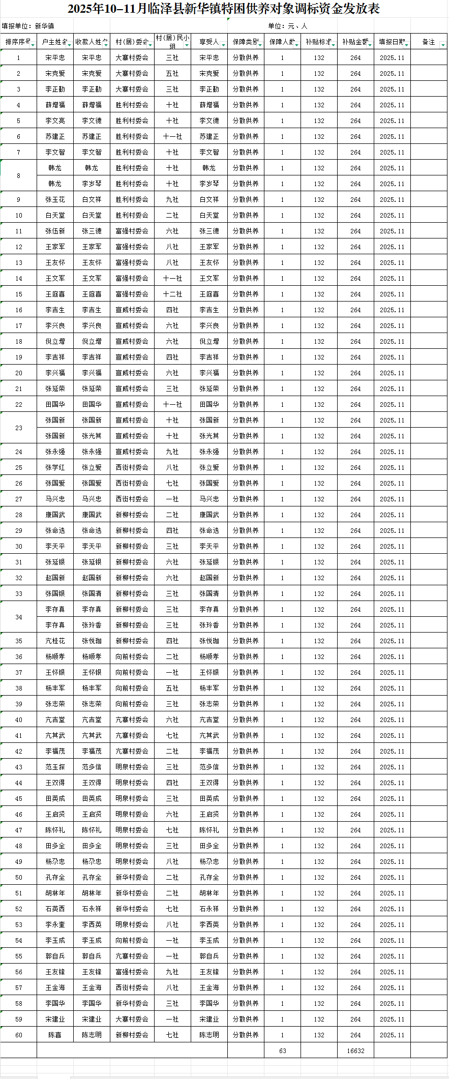 2025年10-11月临泽县新华镇特困供养对象调标资金发放表
