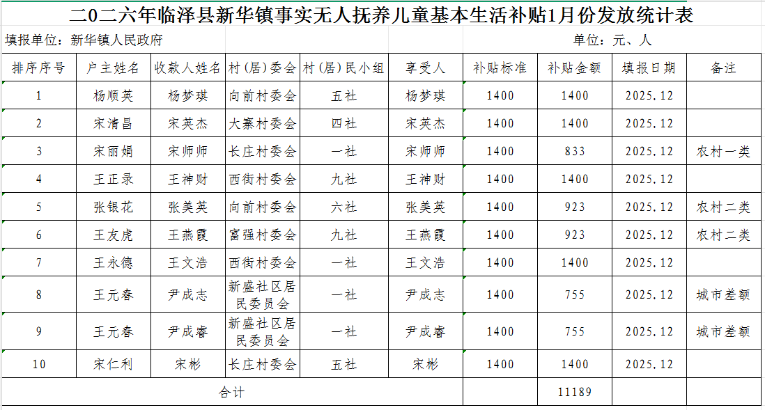 二0二六年临泽县新华镇事实无人抚养儿童基本生活补贴1月份发放统计表