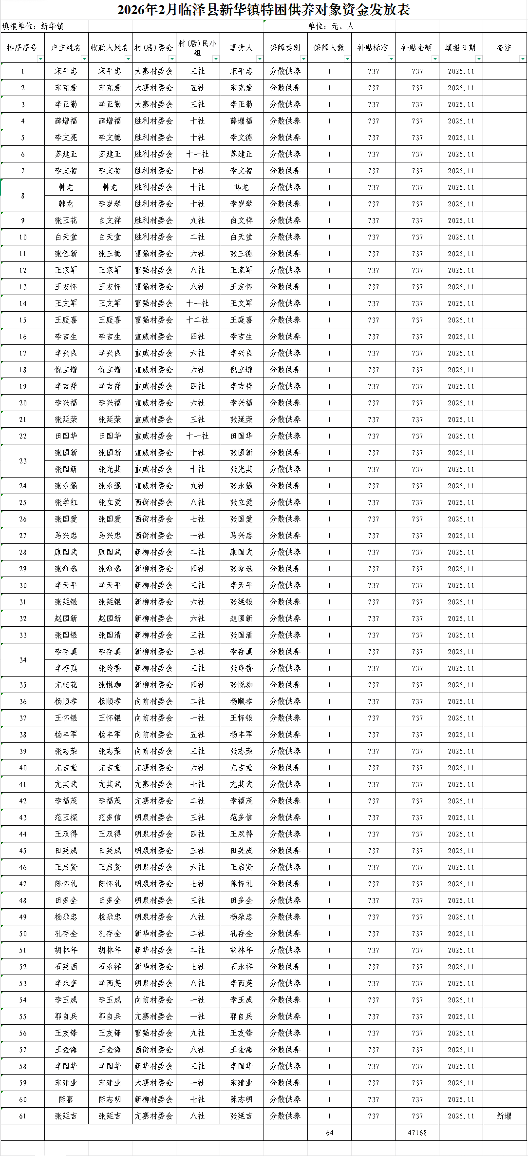 2026年2月临泽县新华镇特困供养对象资金发放表