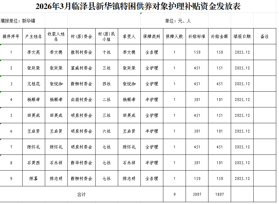 2026年3月临泽县新华镇特困供养对象护理补贴资金发放表