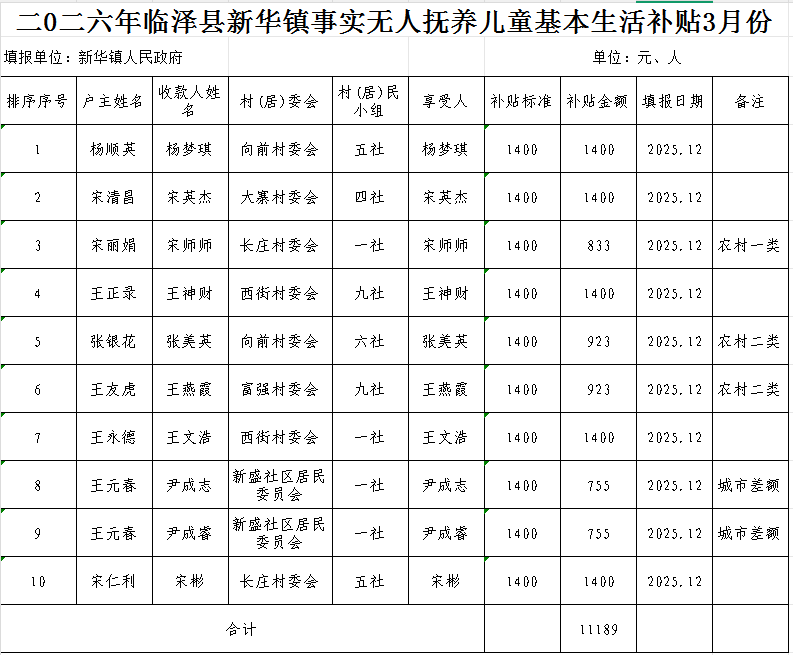 二0二六年临泽县新华镇事实无人抚养儿童基本生活补贴3月份发放统计表