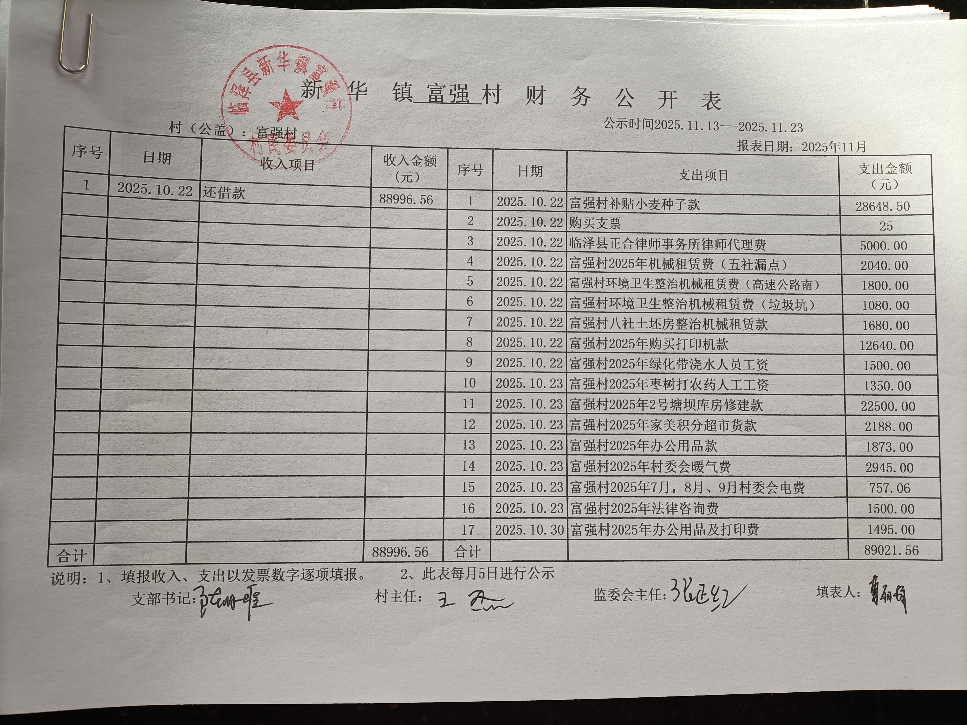新华镇富强村2025年10月份财务公开