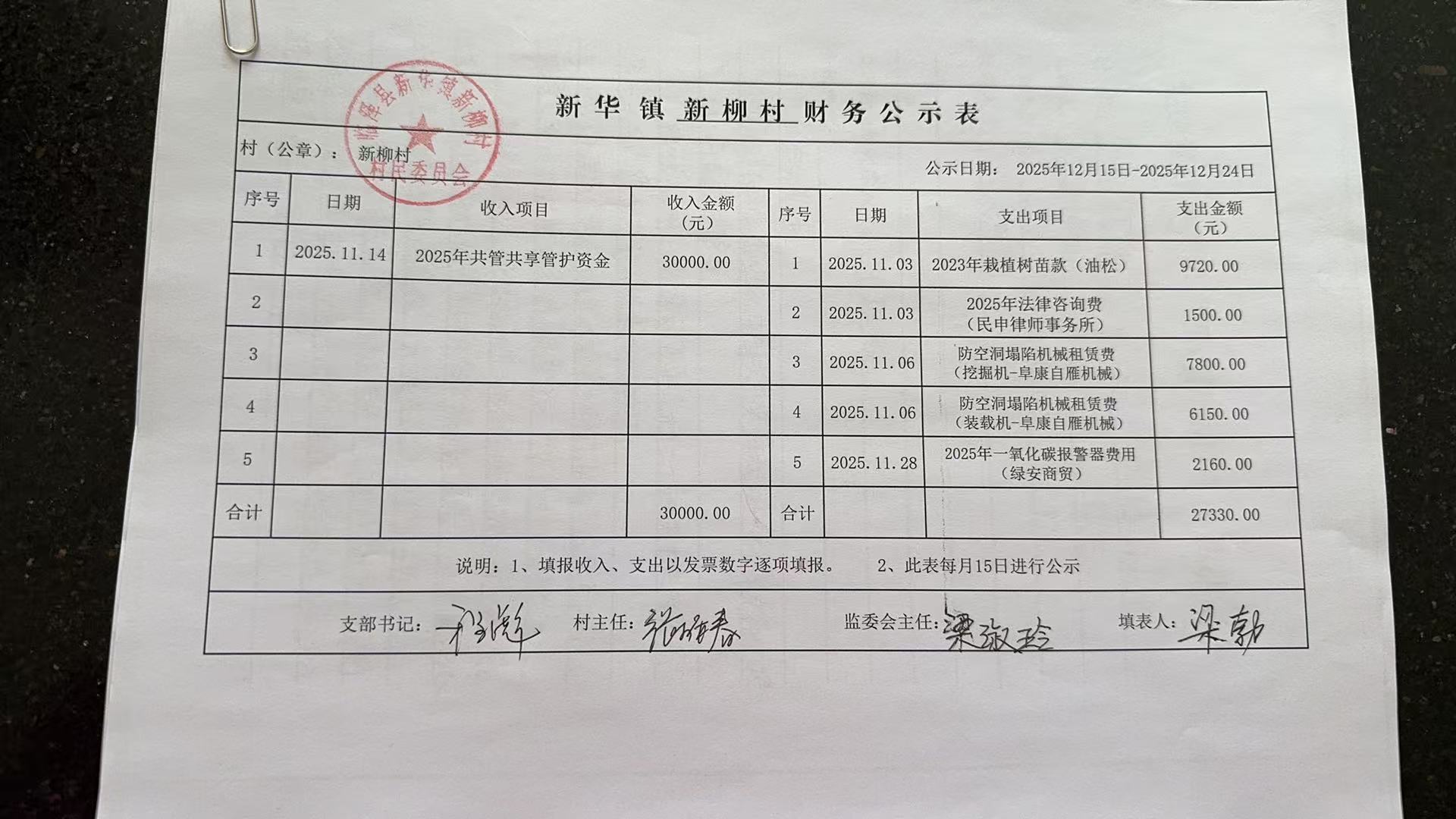 新华镇新柳村2025年11月份财务公开