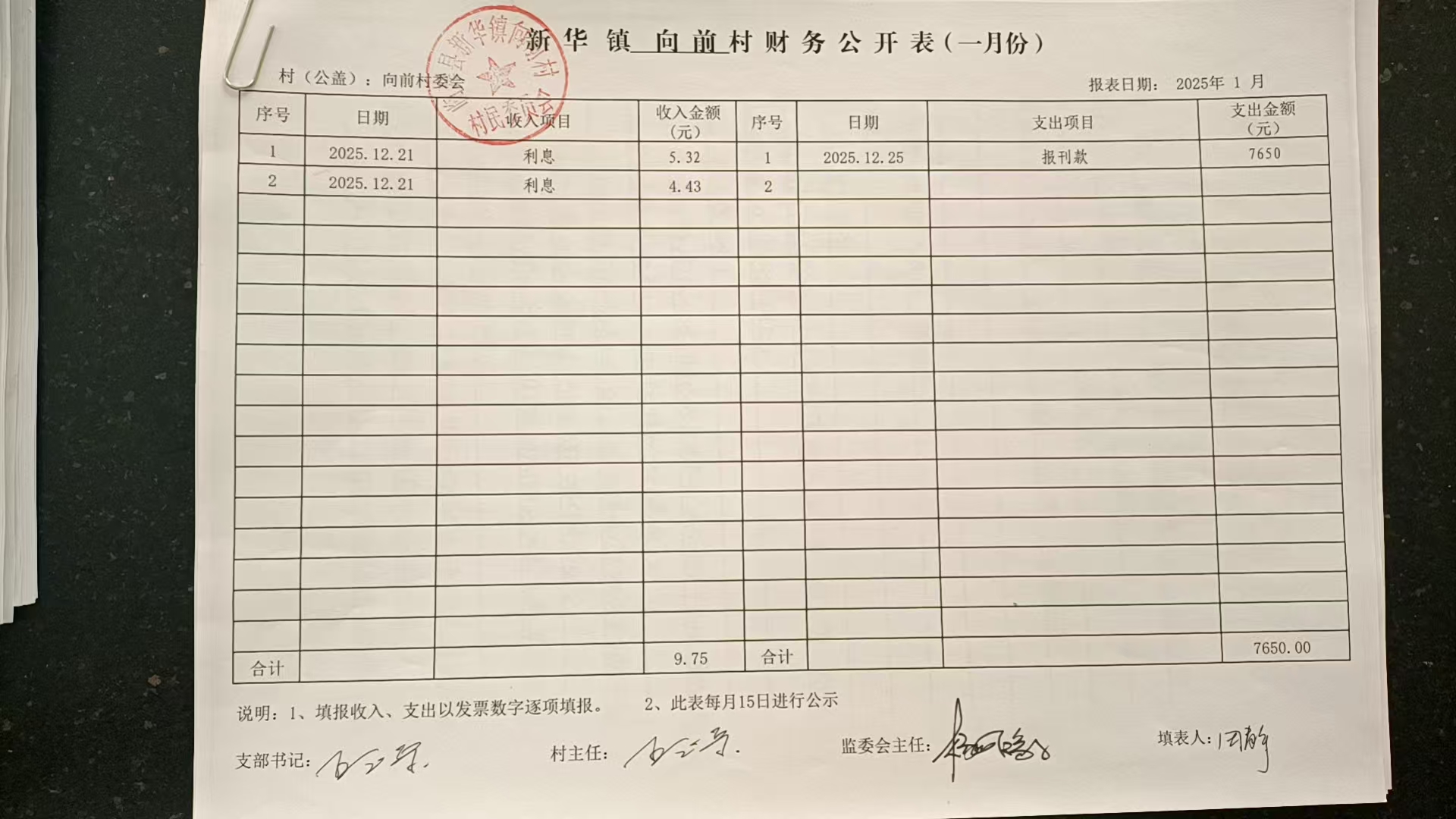 新华镇向前村2025年12月份财务公开