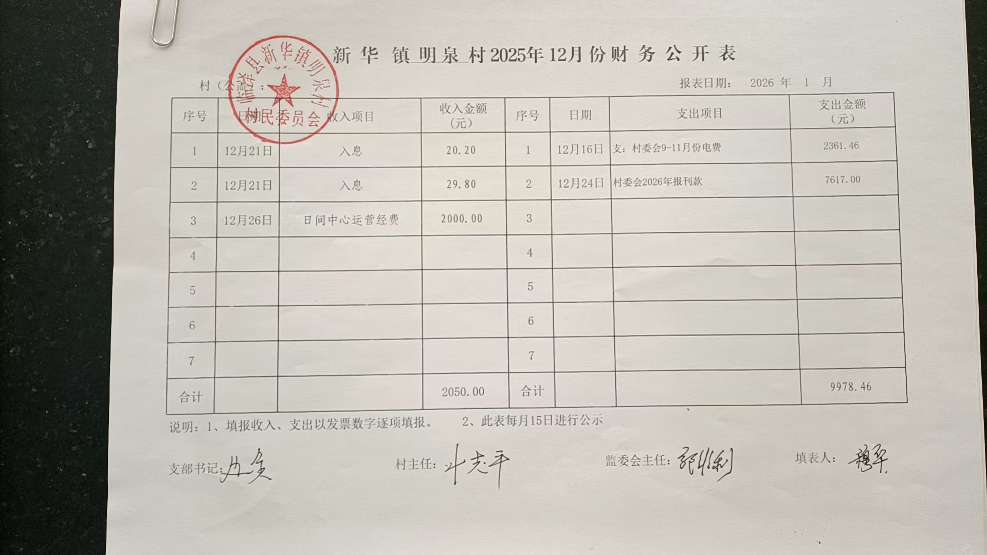 新华镇明泉村2025年12月份财务公开