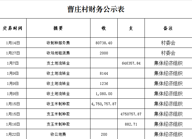 鸭暖镇曹庄村1月财务公示表