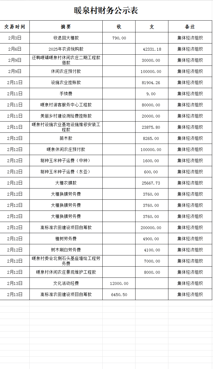 鸭暖镇暖泉村2月财务公示表