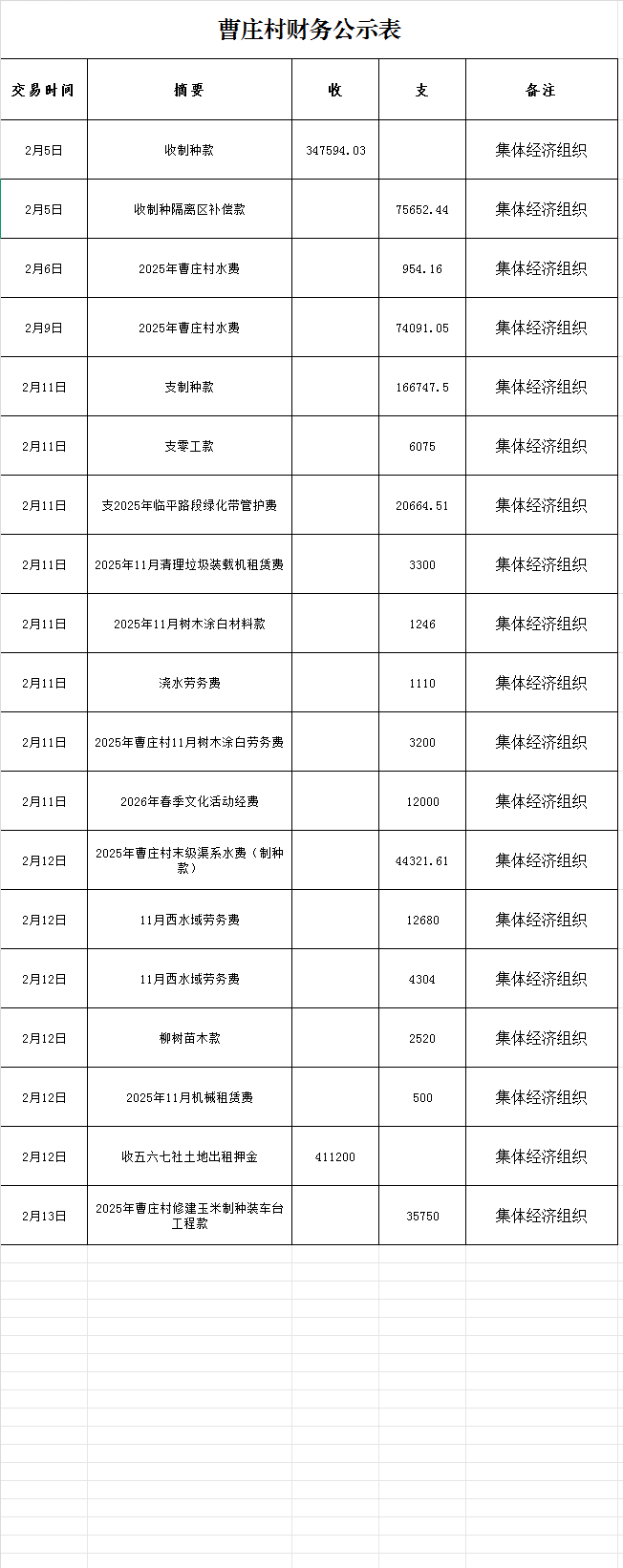 鸭暖镇曹庄村2月财务公示表