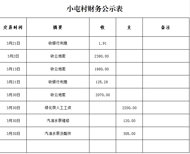 鸭暖镇小屯村3月财务公示表