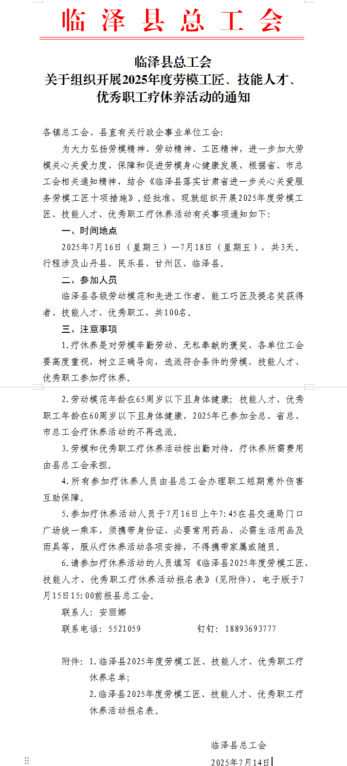 临泽县总工会关于组织开展2025年度劳模工匠、技能人才、优秀职工疗休养活动的通知