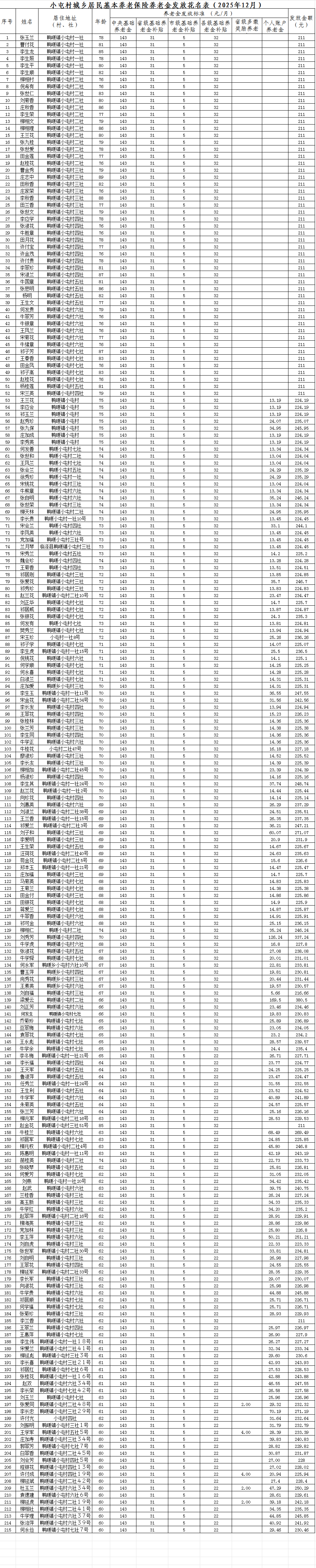 小屯村城乡居民基本养老保险养老金发放花名表(2025年12月)