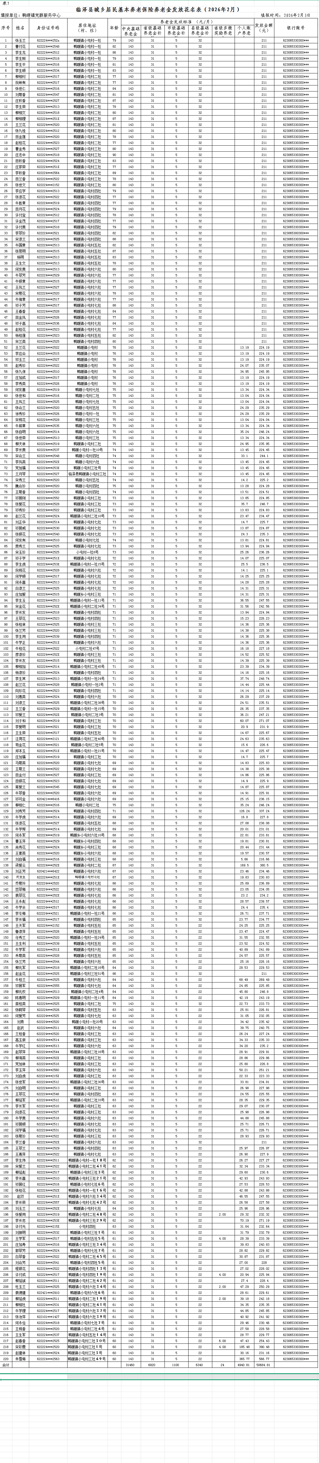 小屯村城乡居民基本养老保险养老金发放花名表(2026年2月)
