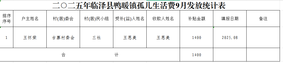 二○二五年临泽县鸭暖镇孤儿生活费9月发放统计表