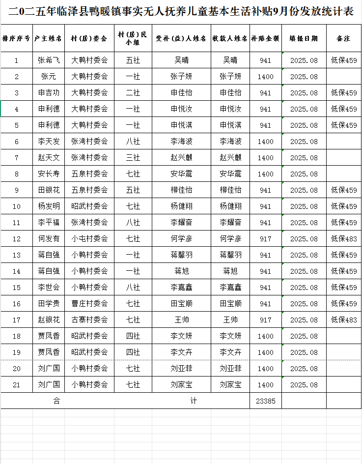 二0二五年临泽县鸭暖镇事实无人抚养儿童基本生活补贴9月份发放统计表