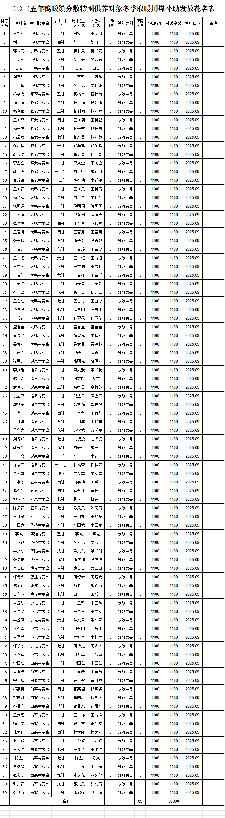 二○二五年鸭暖镇分散特困供养对象冬季取暖用煤补助发放花名表