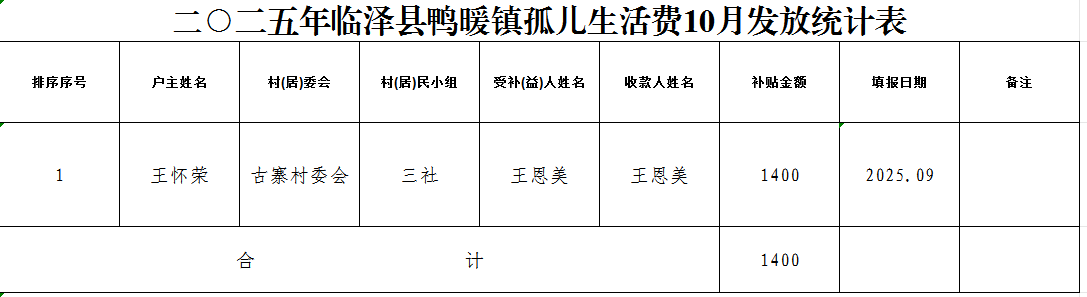 二○二五年临泽县鸭暖镇孤儿生活费10月发放统计表
