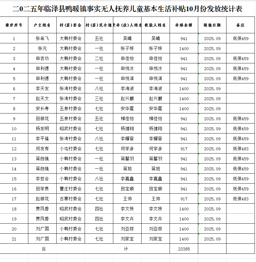 二0二五年临泽县鸭暖镇事实无人抚养儿童基本生活补贴10月份发放统计表