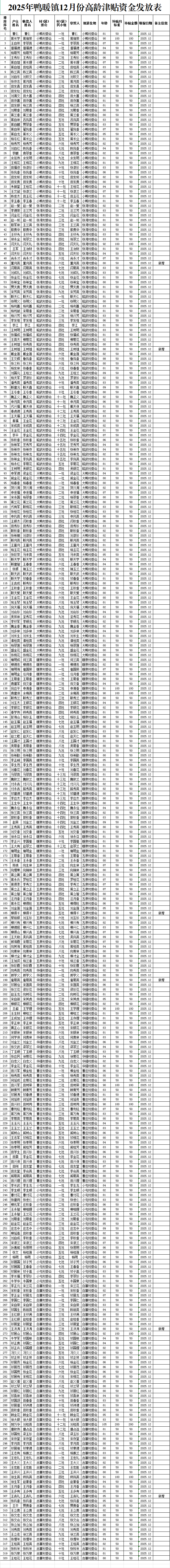 2025年鸭暖镇12月份高龄津贴资金发放表