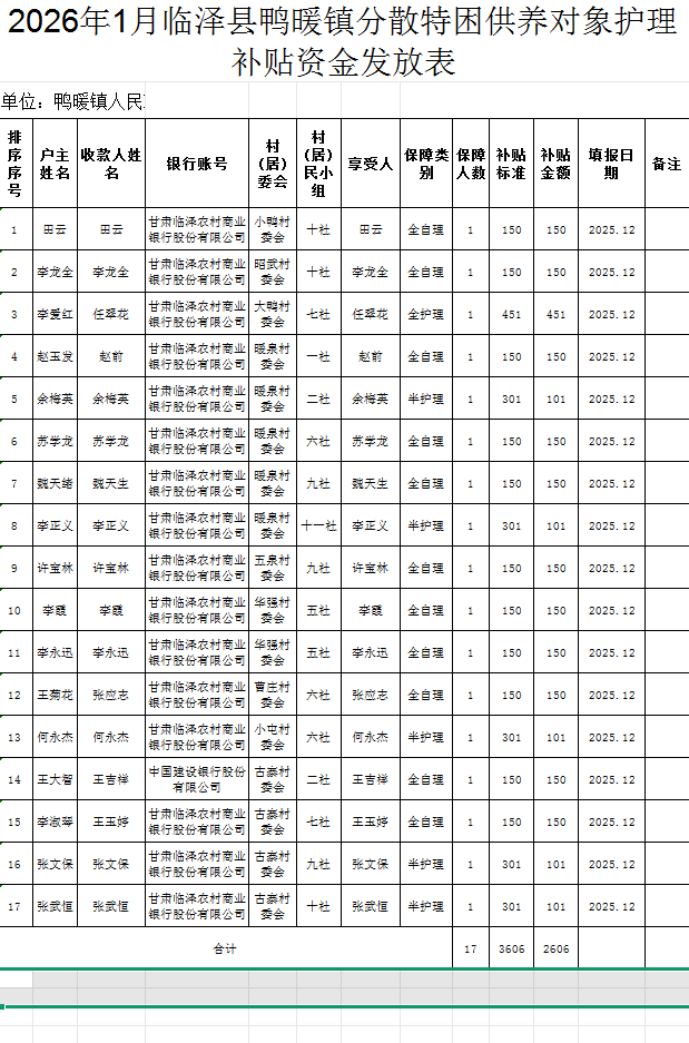 2026年1月临泽县鸭暖镇分散特困供养对象护理补贴资金发放表
