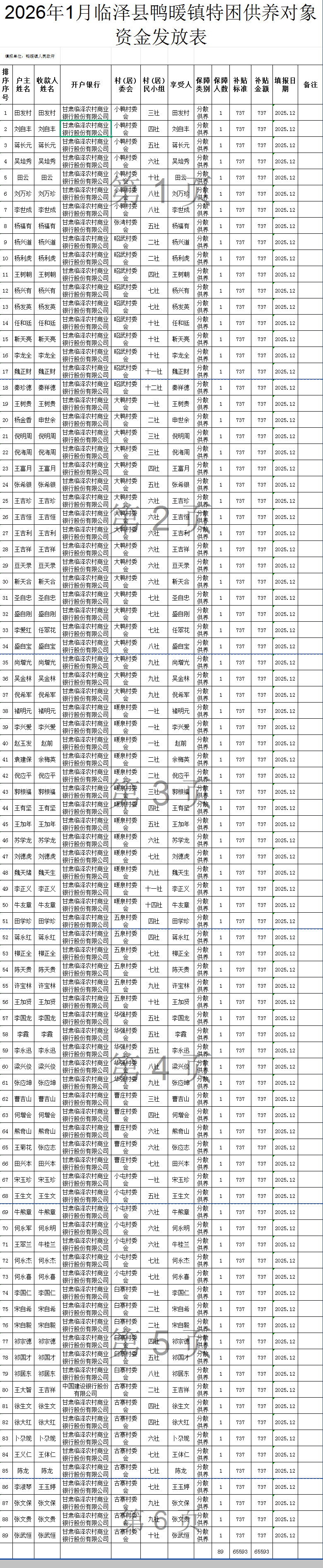 2026年1月临泽县鸭暖镇特困供养对象资金发放表