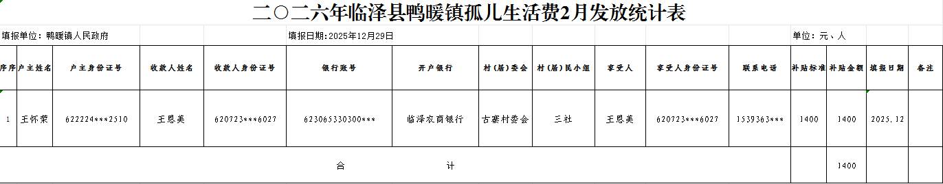 二○二六年临泽县鸭暖镇孤儿生活费2月发放表