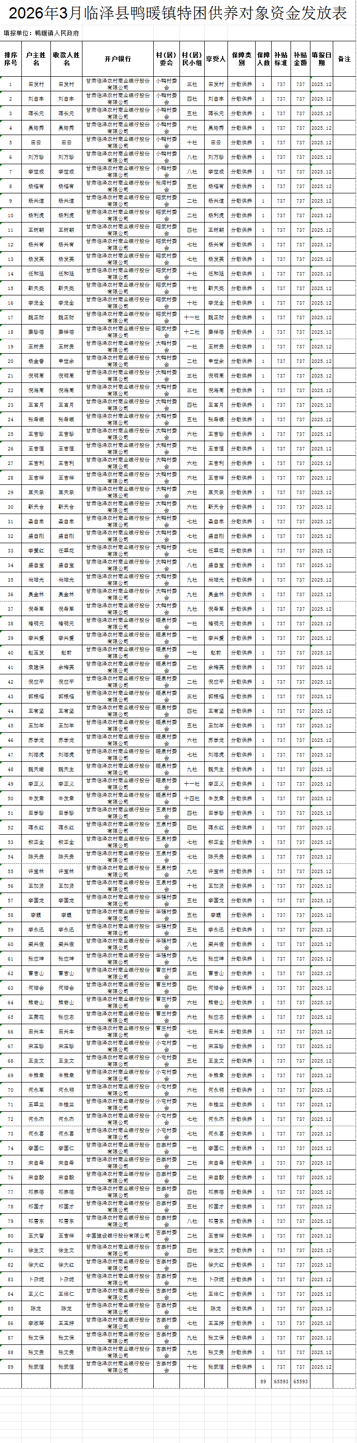 2026年3月临泽县鸭暖镇特困供养对象资金发放表
