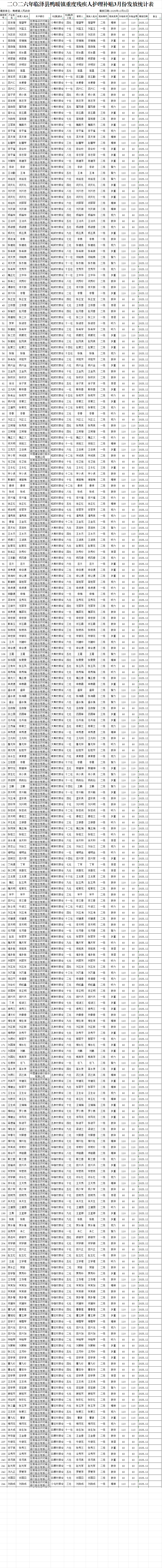 二〇二六年临泽县鸭暖镇重度残疾人护理补贴3月份发放统计表