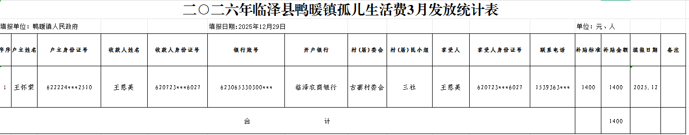 二○二六年临泽县鸭暖镇孤儿生活费3月发放统计表