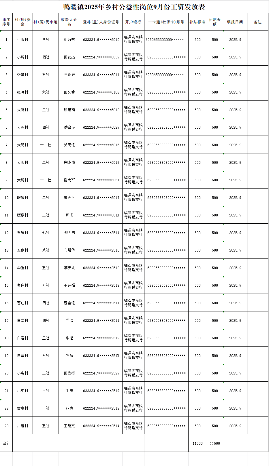鸭暖镇2025年乡村公益性岗位9月份工资发放表