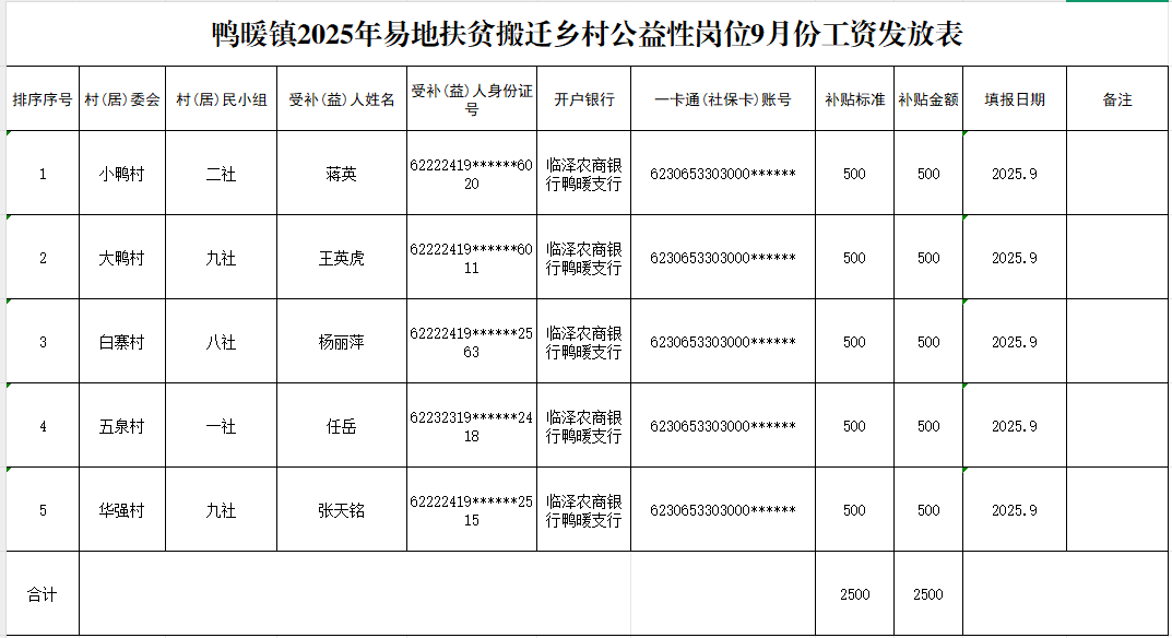 鸭暖镇2025年易地扶贫搬迁乡村公益性岗位9月份工资发放表